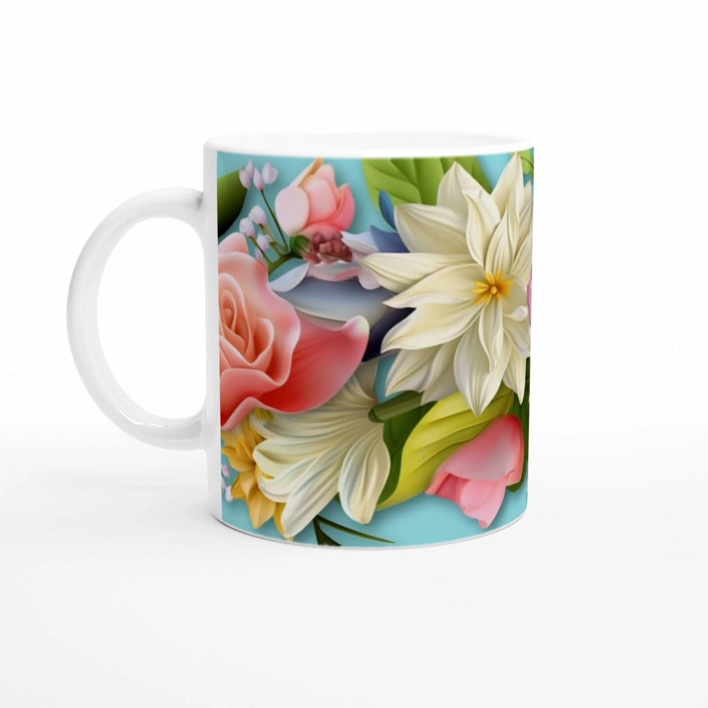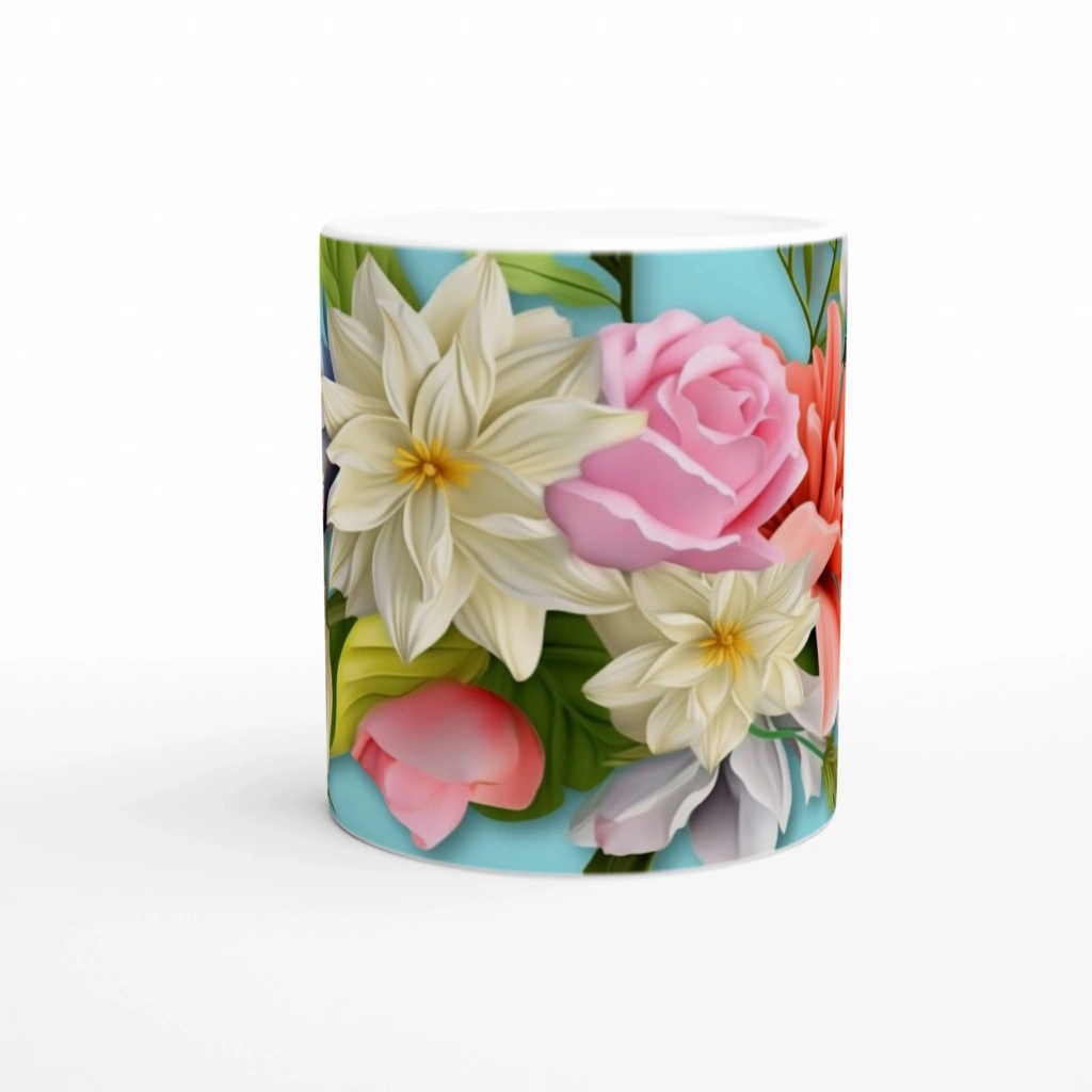 Yumuşak mavi zemin üzerinde sarı, pembe, şeftali ve krem tonlarında 3D çiçeklerle süslenmiş bu kupa bardak, pastel romantizmini sevenlere özel olarak tasarlandı.