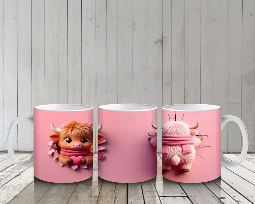 Pembe Arka Planda Sevimli Maskot ve Peluş Karakter – Baskılı Kahve Kupası