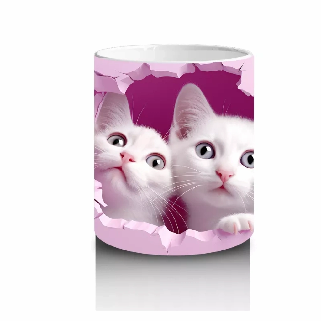 Pembe çatlak arkasından merakla bakan ikiz beyaz kedi yavruları, saf sevimliliği ve masumiyeti yansıtıyor. Kedi severler için hem tatlı hem koleksiyonluk bir kupa seçeneği.