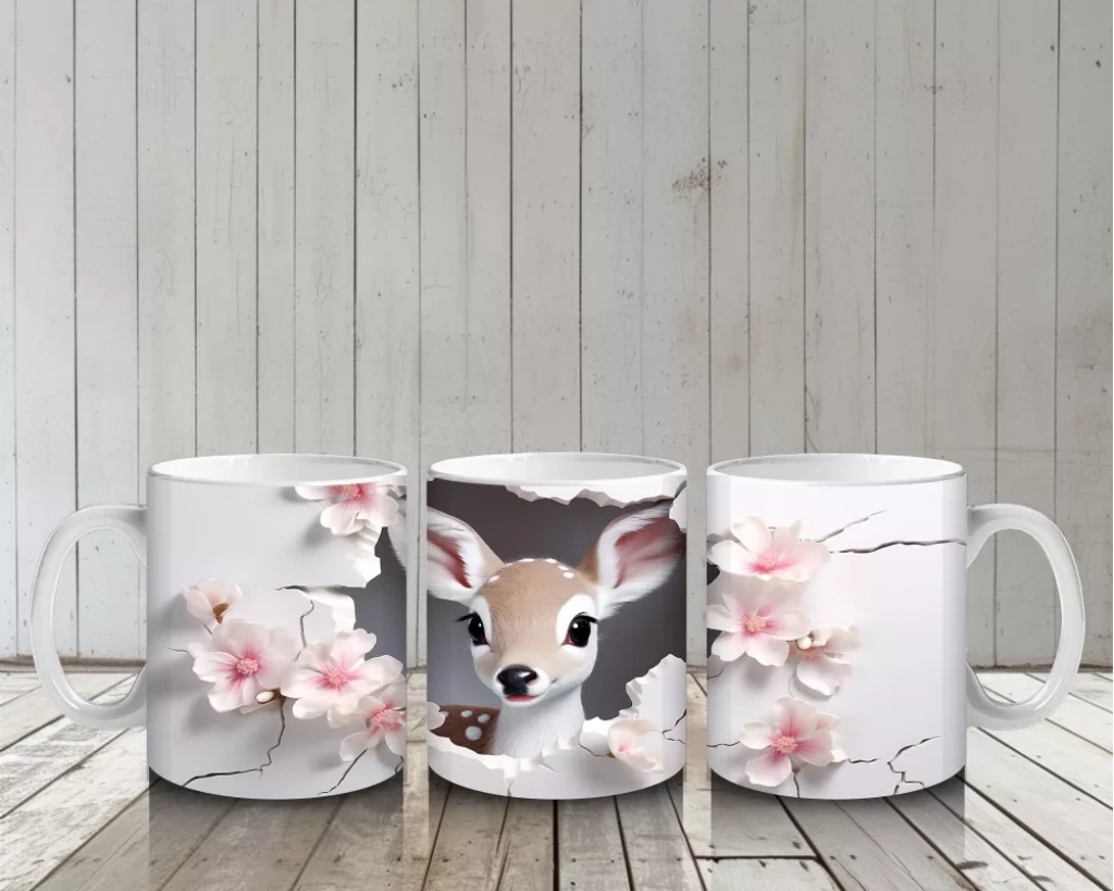 Pembe çiçeklerle çevrelenmiş bu sevimli geyik figürü, zarif ve huzur dolu bir atmosfer yaratıyor. Doğa temalı, içten ve romantik bir kupa tasarımı arayanlar için ideal.