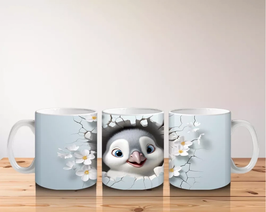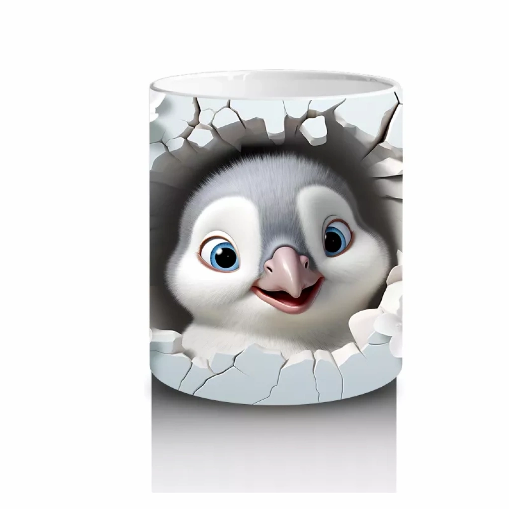 Pembe çiçeklerin arasında gülümseyen penguen figürü, sıcaklık ve mutluluğu yansıtıyor. Romantik ve neşeli tasarımları tercih edenler için ideal bir seçenek.