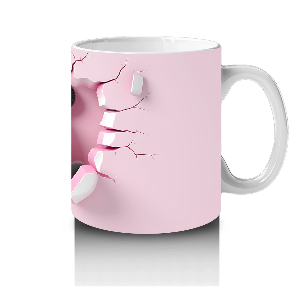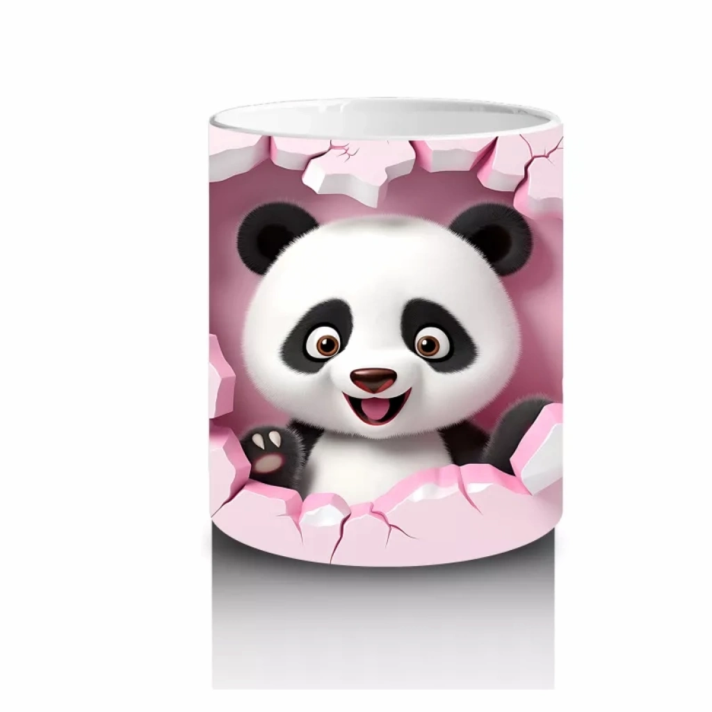 Pembe duvar arasında neşeyle duran panda, sevimli ve pozitif bir enerji yayıyor. Tatlı ve sıcak detayları sevenler için özel bir kupa tasarımı.