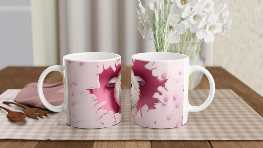 Pembe Duvar Çatlaktan Bakan Karikatürik Kuzu Temalı Baskılı Kupa Bardak, kırık efektli pembe duvar ve uçuşan kalplerle eğlenceli ve sıcak bir tasarım sunuyor. Özellikle çocuklara yönelik hediyeliklerde ideal bir tercih.