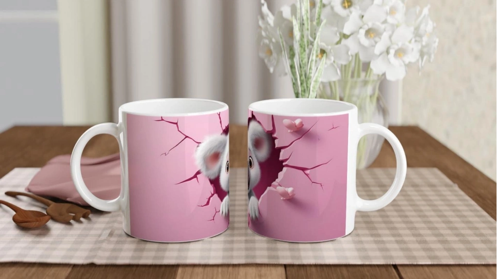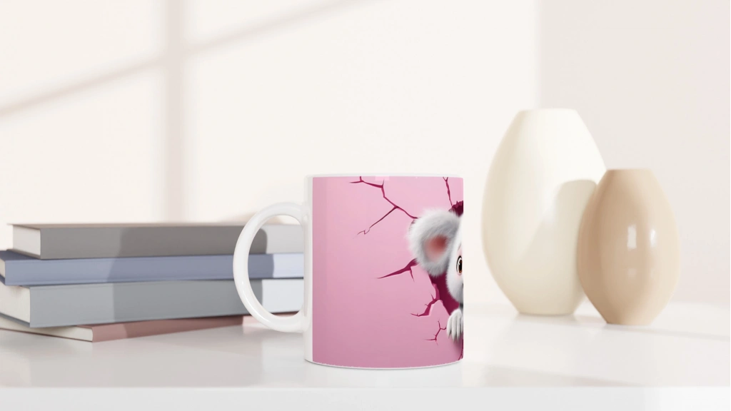 Pembe Duvarı Yırtarak Bakan Sevimli Koala Temalı Baskılı Kupa Bardak, pembe kalp detaylarıyla süslenmiş çatlak duvar efektiyle birlikte masum ve mutlu koala karakterini öne çıkarıyor. Gülümseten detaylarıyla her yaşa hitap eden keyifli bir tasarımdır.
