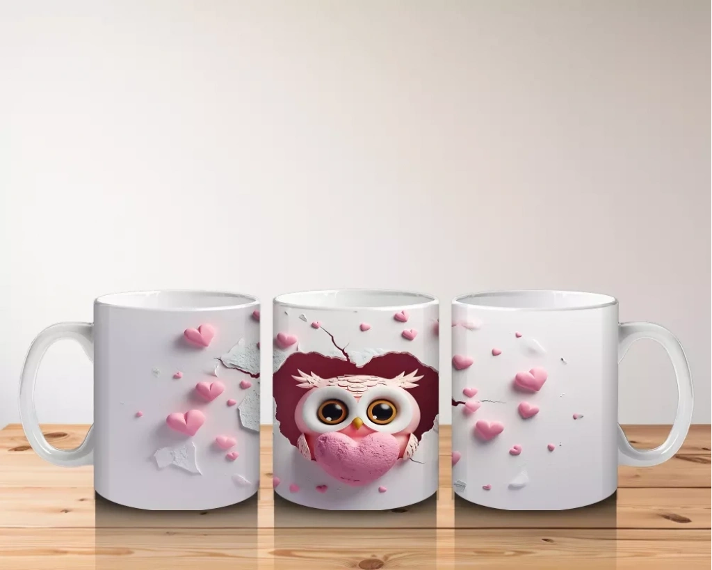 Pembe Kalp Yağmuru Altında Baykuş Maskotu – Baskılı Kahve Kupası
