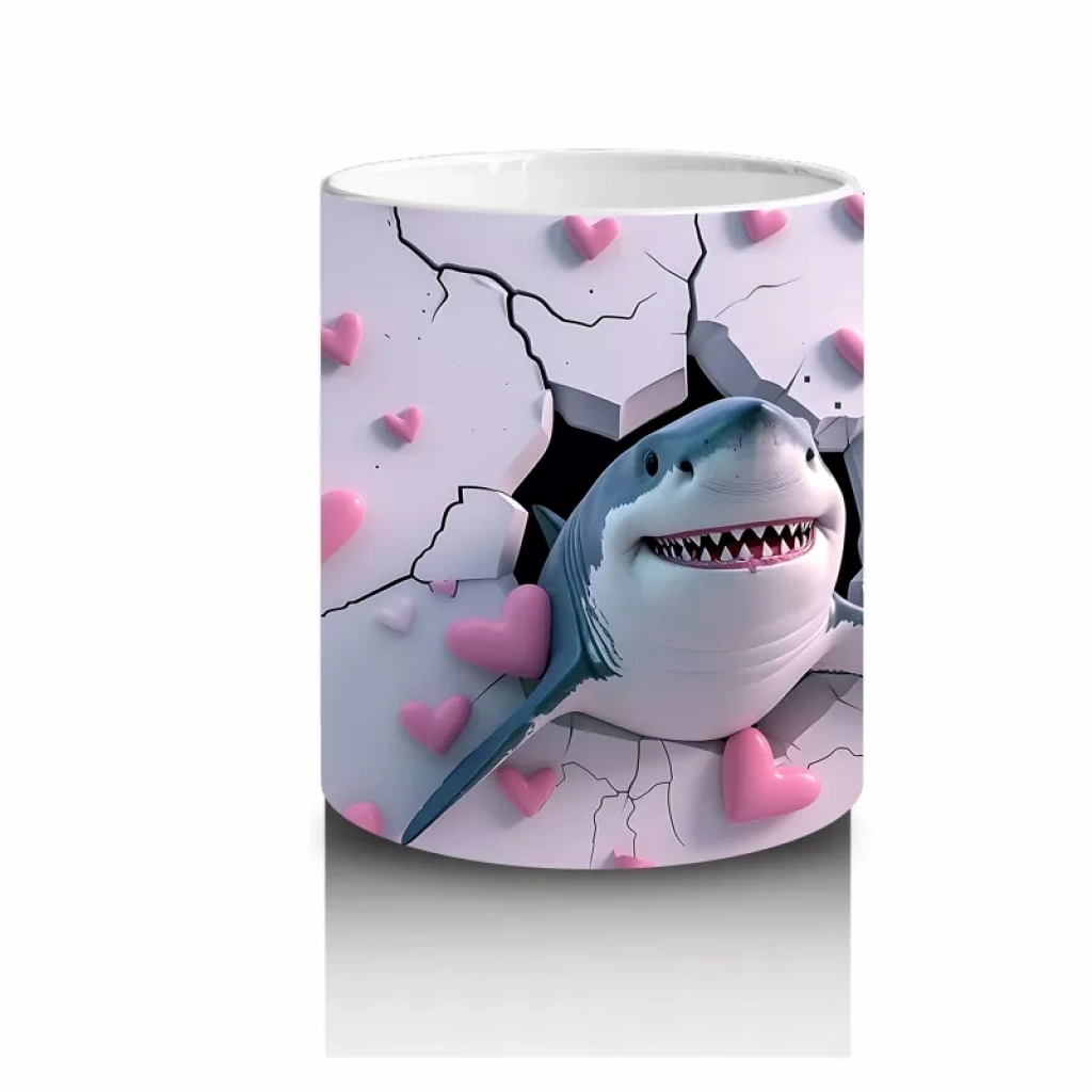 Pembe kalplerin arasında neşeyle zıplayan sevimli köpekbalığı, pozitif enerji ve sevgi dolu bir atmosfer yaratıyor. Sıcacık ve neşeli tasarımlar arayanlar için özel bir kupa.