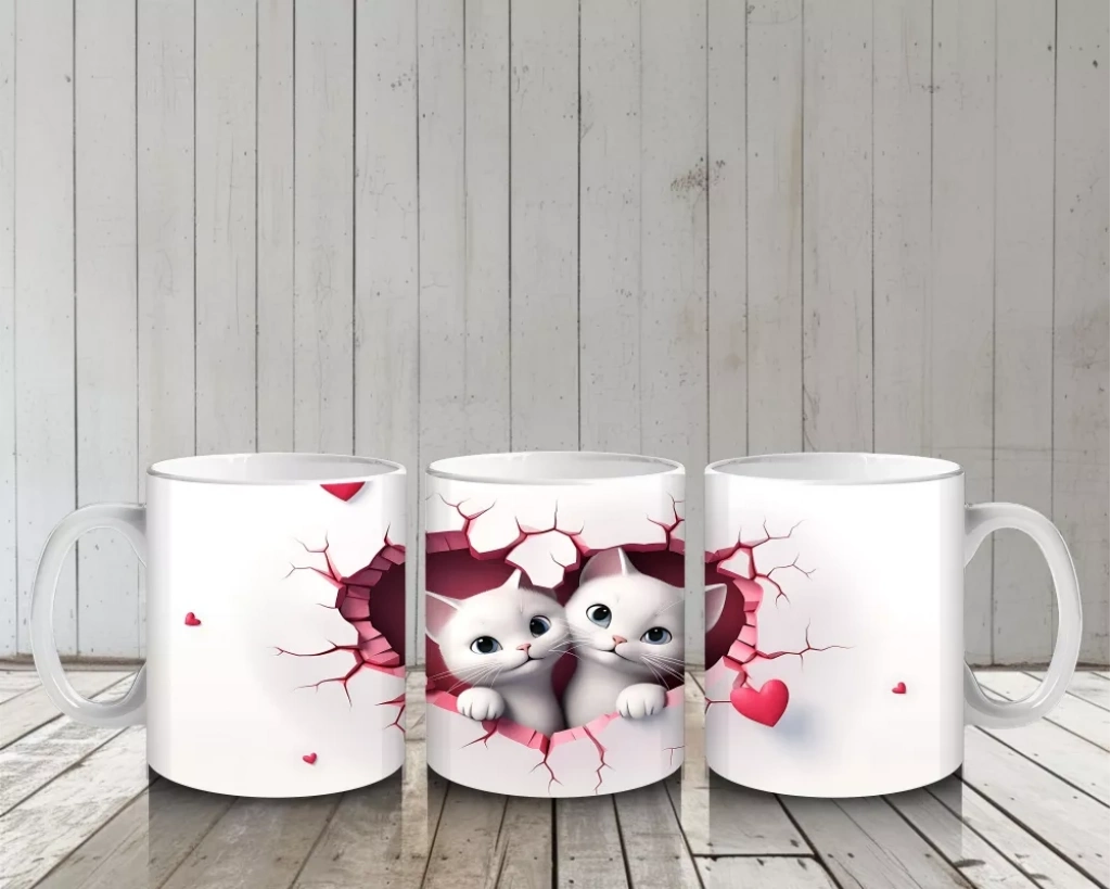 Pembe kalplerle çevrili iki beyaz kedi, sevgi dolu ve huzurlu bir sahne oluşturuyor. Romantik ve sıcak detayları sevenler için özel bir kupa tasarımı.