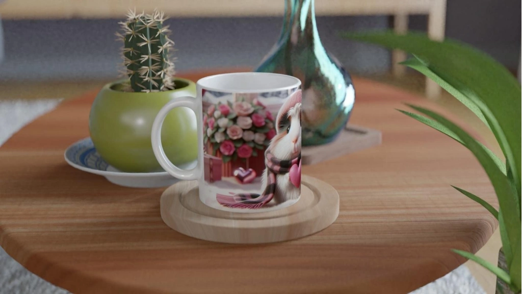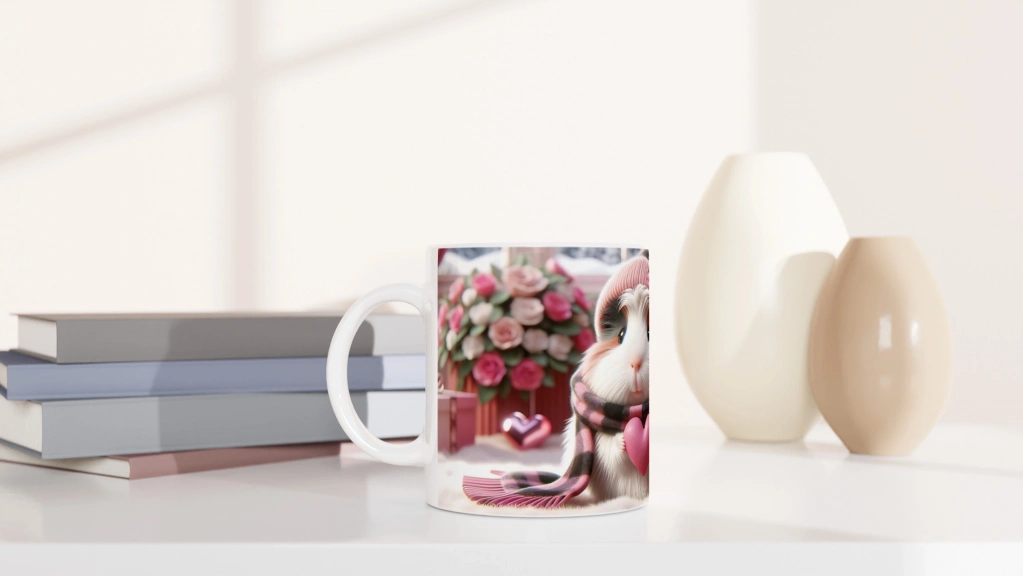 Pembe Kalpli Şapkalı Ginepig Temalı Baskılı Kupa Bardak, kış atmosferi, şirin atkısı ve kalp detayıyla aşkın ve sıcaklığın simgesi oluyor. Sevdiklerinize özel günlerde sunabileceğiniz romantik ve neşeli bir hediye seçeneğidir.