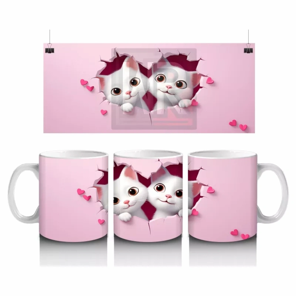 Pembe kalpli zeminden bakan sevimli ikiz kediler, neşe ve birlikteliği yansıtıyor. Tatlı ve pozitif detayları tercih edenlere özel sıcak bir tasarım.