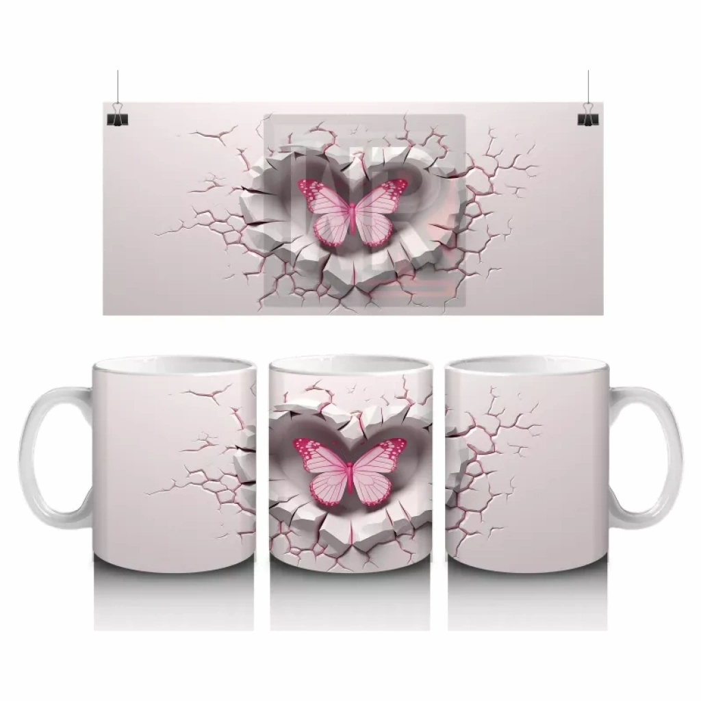 Pembe kelebek figürünün ön planda olduğu çatlak kalp teması, sevgi ve doğallığı bir araya getiriyor. Hem modern hem duygusal detayları sevenler için özgün bir kupa tasarımı.