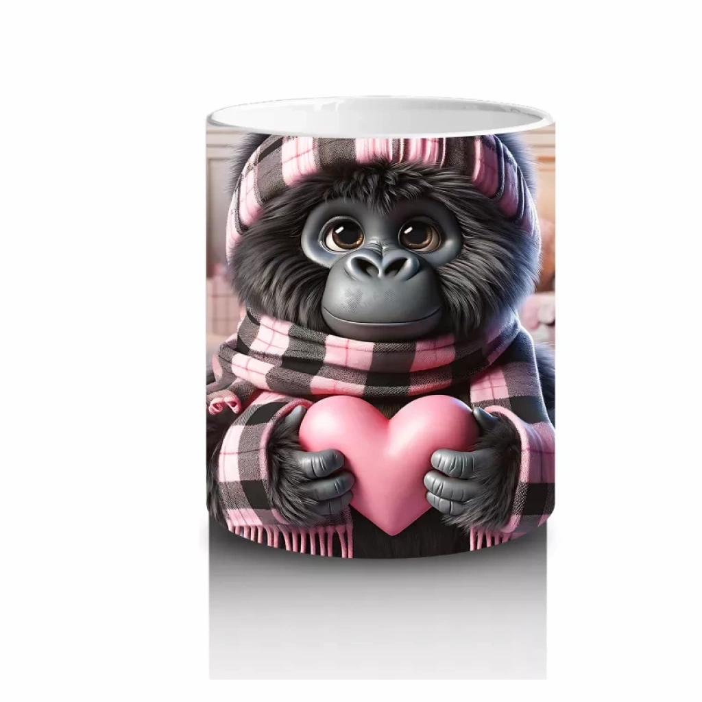 Pembe Kurdeleli Kalpli Figür Tutan Sevimli Maymun – Baskılı Kahve Kupası