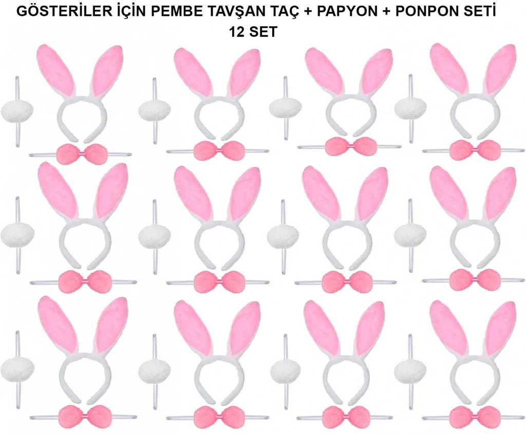 Pembe Tavşan Kostüm Seti – 12’li Paket (Taç + Papyon + Ponpon)