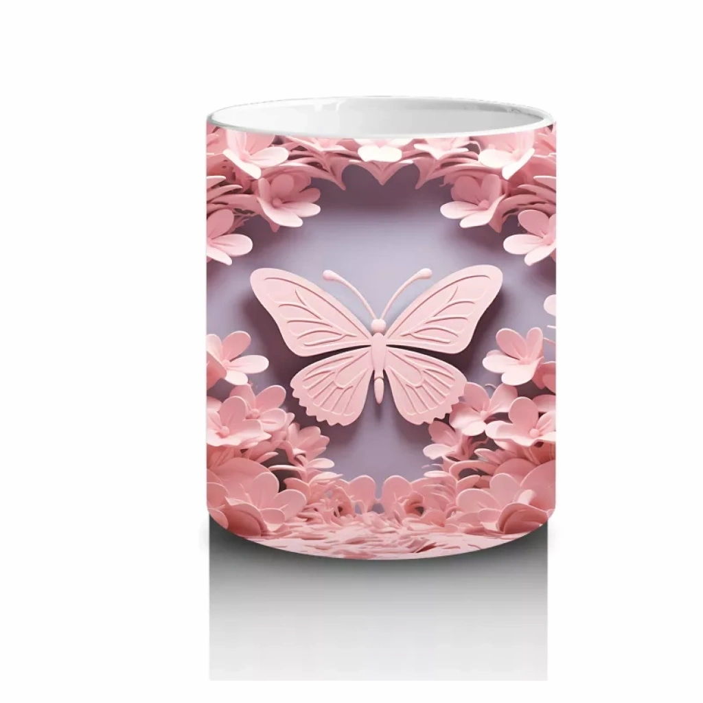 Pembe yaprakların arasında süzülen bu zarif kelebek, doğanın romantik yüzünü yansıtıyor. Hafifliği ve estetiği bir arada sunan bu tasarım, huzurlu kahve anları için ideal.