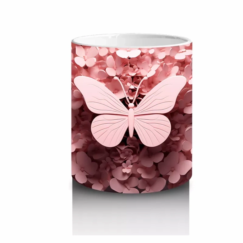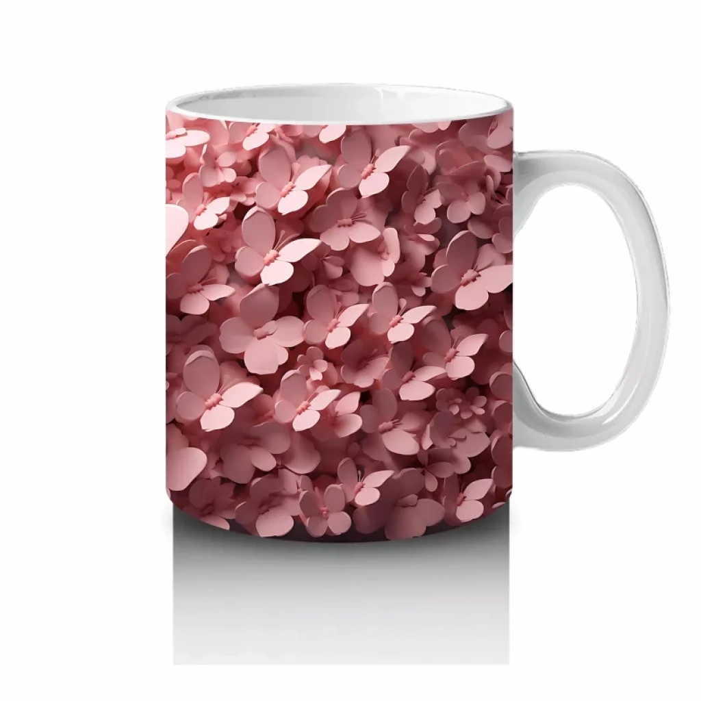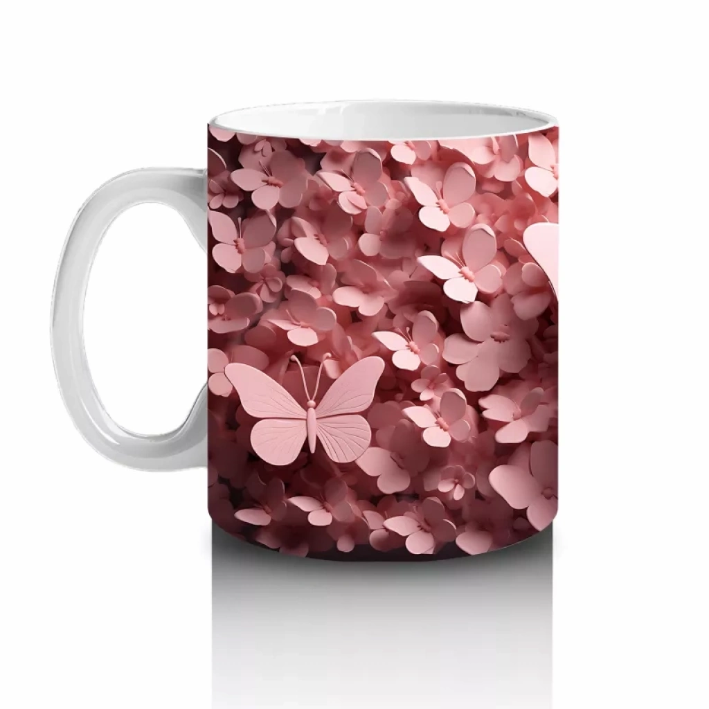 Pembe yapraklar arasında süzülen zarif kelebek, doğanın ve narinliğin uyumunu yansıtıyor. Romantik ve şiirsel bir tasarım arayanlara özel, yumuşak dokunuşlu bir kupa.