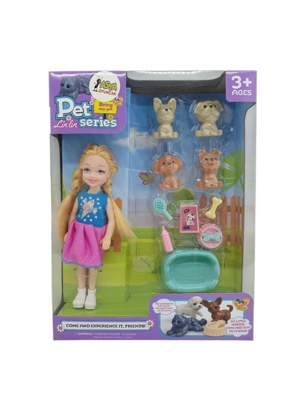 Paket içerisinde 1 adet bebek , 4 adet köpek figürü ve 6 adet bakım seti aksesuarı bulunmaktadır.