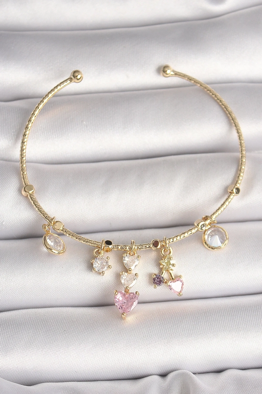 Pirinç Gold Renk Sallantı Zirkon Taşlı Kalp Figür Pembe Kalp Detay Charm Kadın Bileklik