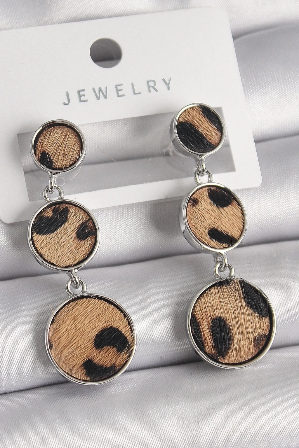 Pirinç Gümüş Renk 3'Lü Daire Plaka Leopar Desenli Kadın Küpe