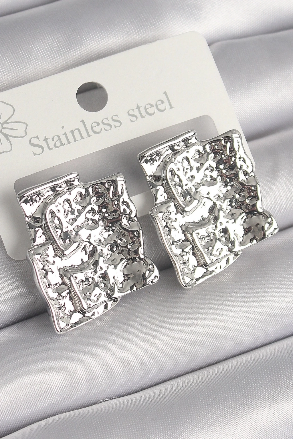 Pirinç Gümüş Renk İşlemeli Kare Plaka Model Kadın Küpe