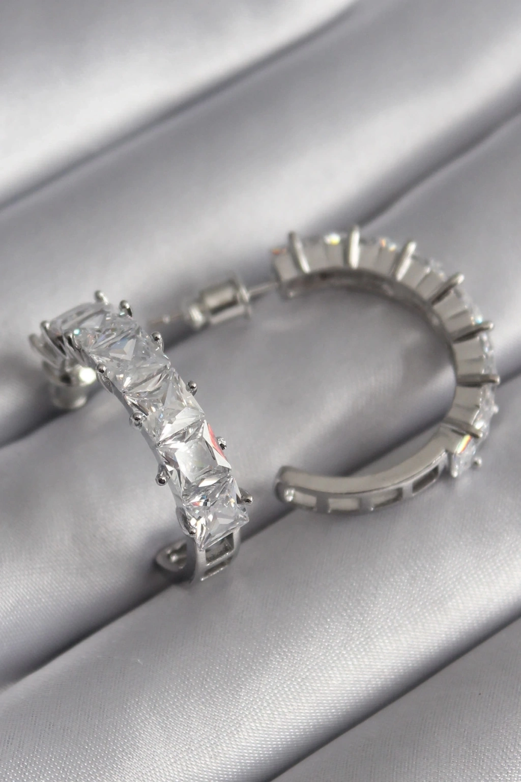 Pirinç Gümüş Renk Zirkon Taşlı Halka Model Kadın Küpe