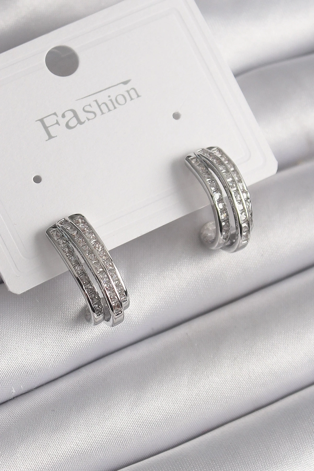 Pirinç Gümüş Renk Zirkon Taşlı Yarım Halka Model Kadın Küpe