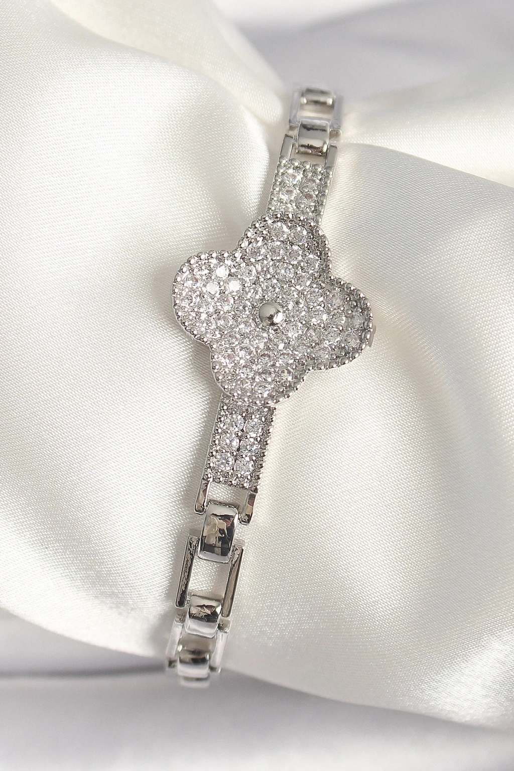 Pirinç Gümüş Renk Zirkon Taşlı Yonca Model Kadın Bileklik