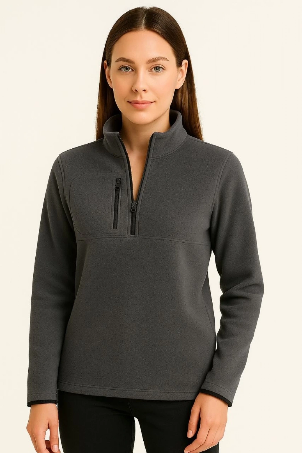 Polar Kazak – Dik Yaka, Yarım Fermuarlı, Fermuarlı Göğüs Cepli, Siyah Biyeli, Kışlık Rahat Regular Fit Günlük Model - Füme