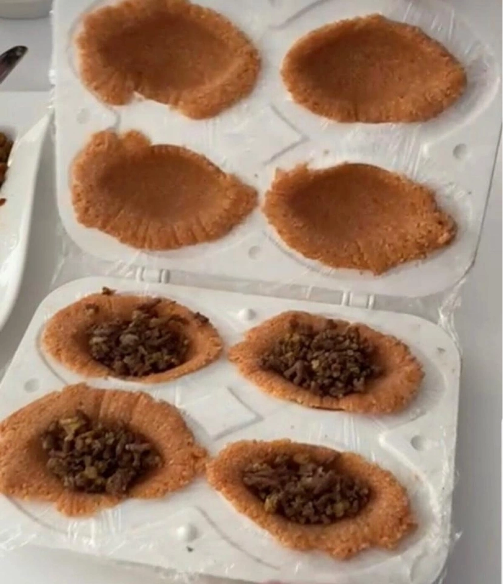 - Çift tarafı çukurlanan köfte hamurunuzun bir tarafına köfte harcı koyunuz.