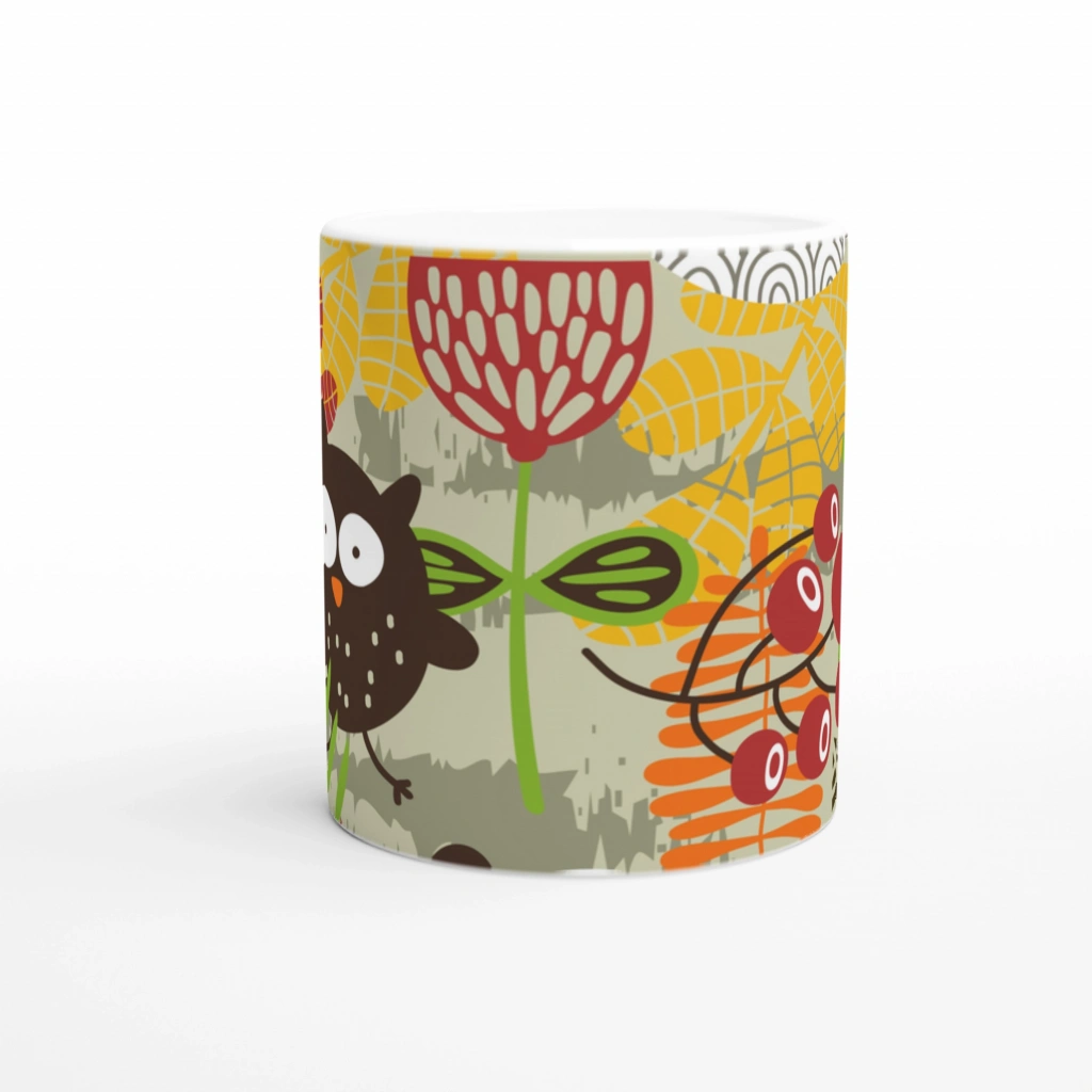 Renkli Baykuş ve Yaprak Desenli Kupa Bardak, doğa unsurlarıyla harmanlanmış eğlenceli çizgileriyle çocuk ruhunu yansıtan bir stilde tasarlandı.