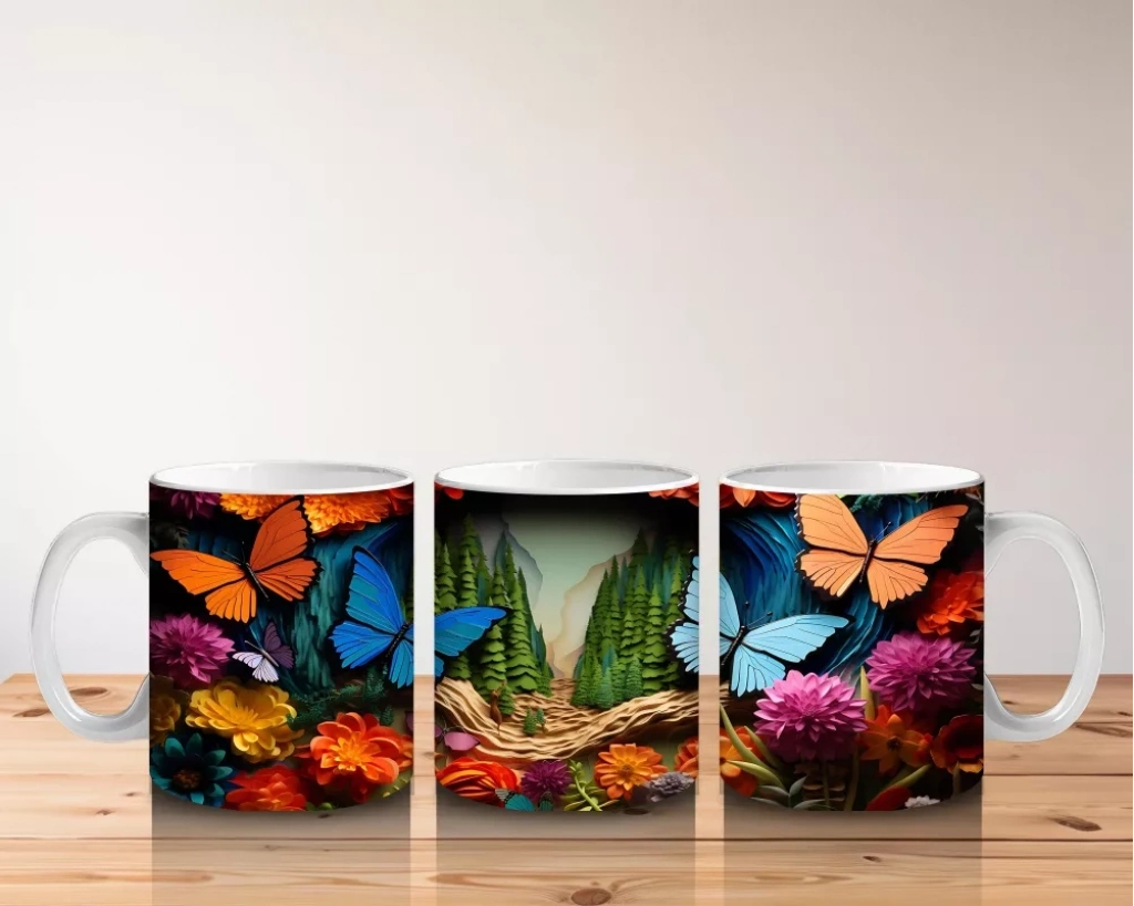 Cam mozaik etkisiyle parlayan mavi ve turuncu kelebekler, sanatsal bir doku ve göz alıcı renk geçişleri sunuyor. Detaylı ve estetik tasarımlardan hoşlananlara özel benzersiz bir kupa modeli.
