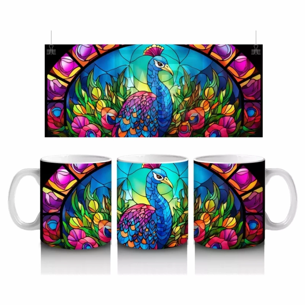 Renkli cam vitray stilindeki tavus kuşu, zarif ve sanatsal bir görünüm sergiliyor. Sanat ve doğa tutkunları için özel bir kupa tasarımı.