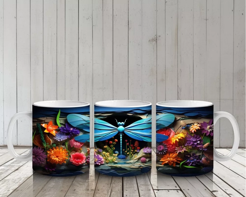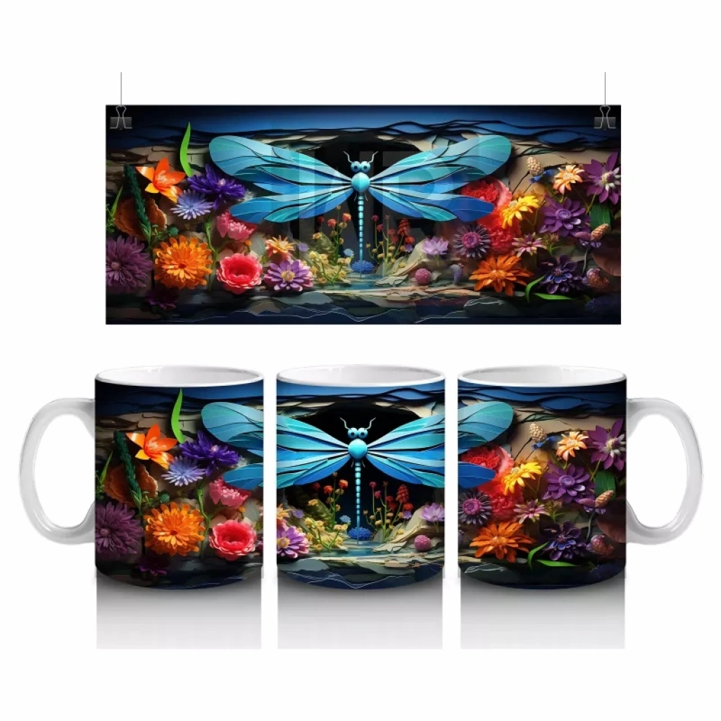 Renkli Çiçek Bahçesinde Çift Mavi Yusufçuk – Baskılı Kahve Kupası