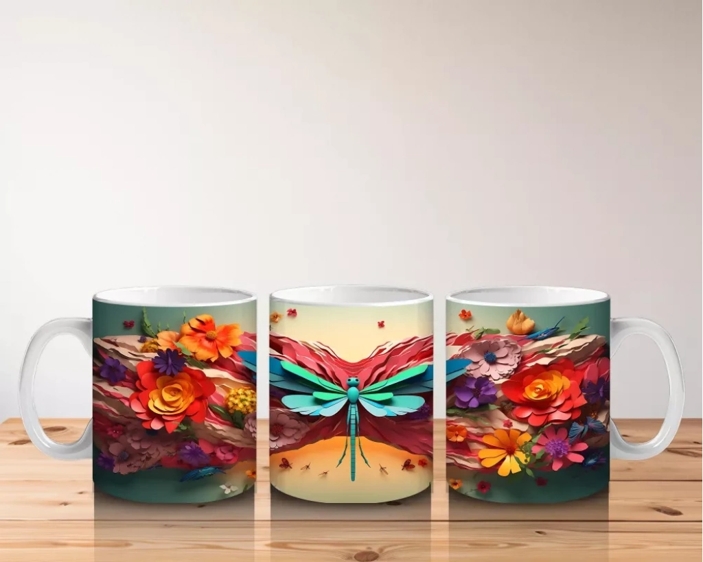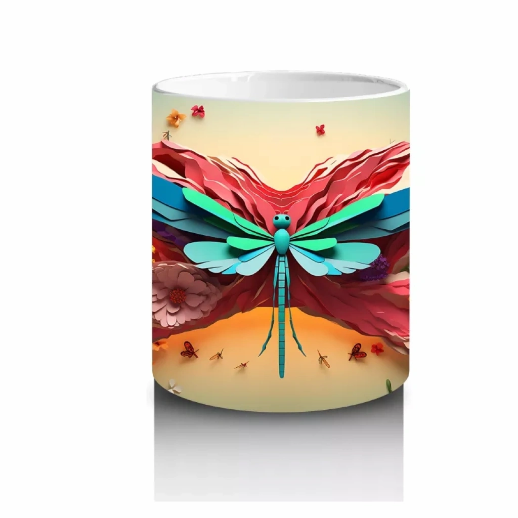 Renkli Çiçek Bahçesinde Parlayan Pembe Kanatlı Yusufçuk – Baskılı Kahve Kupası