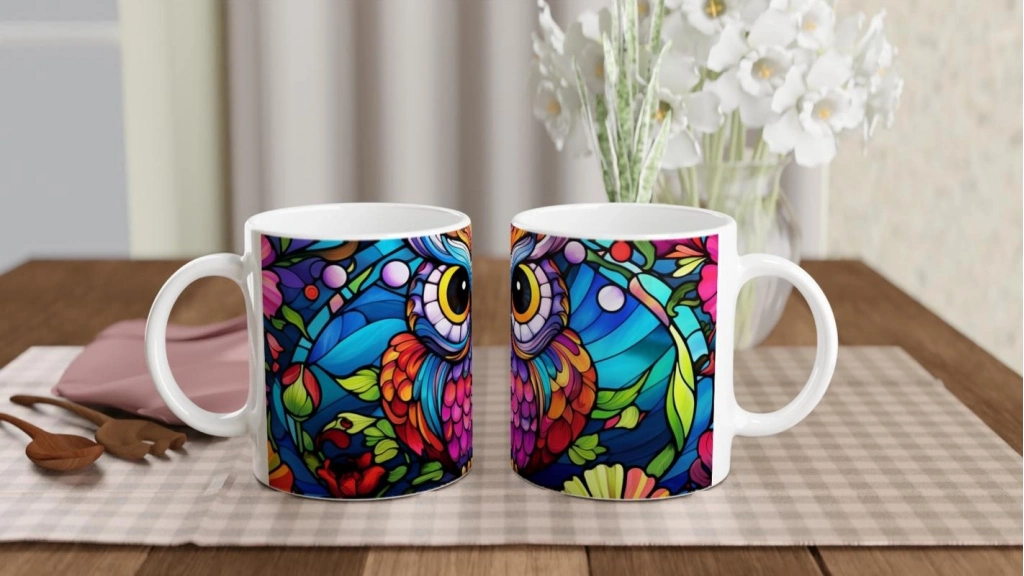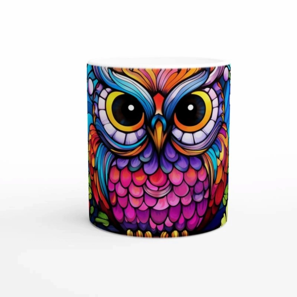 Renkli Çiçekler Arasında Vitray Baykuş Baskılı Kupa Bardak, büyük gözleri ve göz alıcı tüy detaylarıyla hem neşeli hem de sanatsal bir duruş sergiliyor. Renklerin enerjisini yansıtan bu özel tasarım, baykuş baskılı kupa sevenler için benzersiz bir seçim.