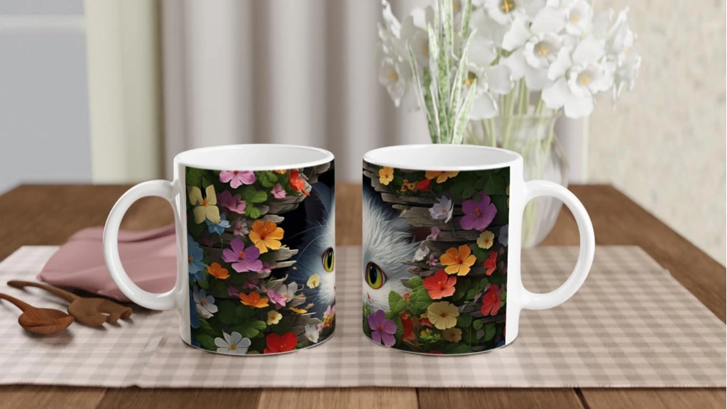 Renkli Çiçeklerle Çevrili Meraklı Kedi Baskılı Kupa Bardak, doğayla iç içe bir zarafet ve sevimlilik arayanlar için özel olarak tasarlandı.