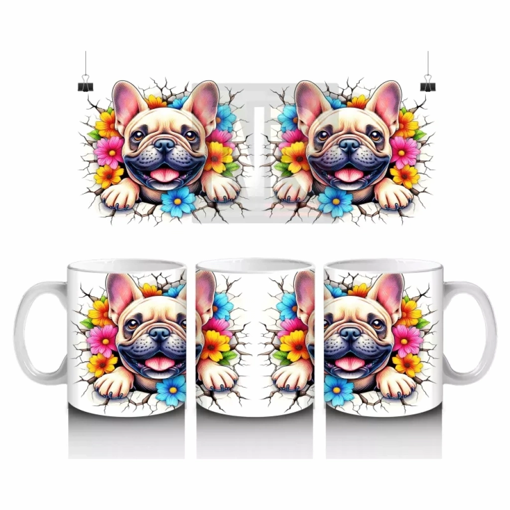 Renkli çiçeklerle süslenmiş fonda duran Fransız Bulldog figürü, canlılık ve sevimliliği bir arada sunuyor. Modern ve enerjik tasarımlar sevenler için özel bir kupa.