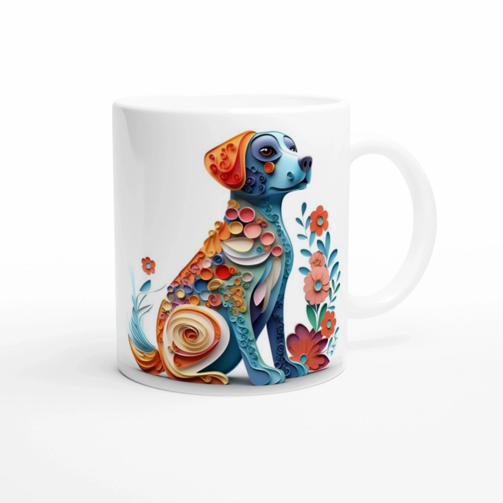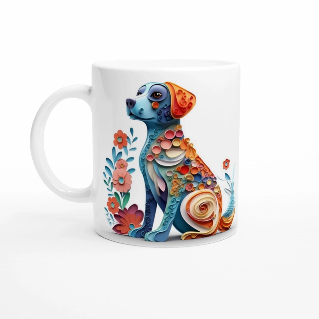 Bu zarif köpek figürlü kupa bardak, renkli çiçek detayları ve şık tasarımıyla göz alıcı bir parça.
