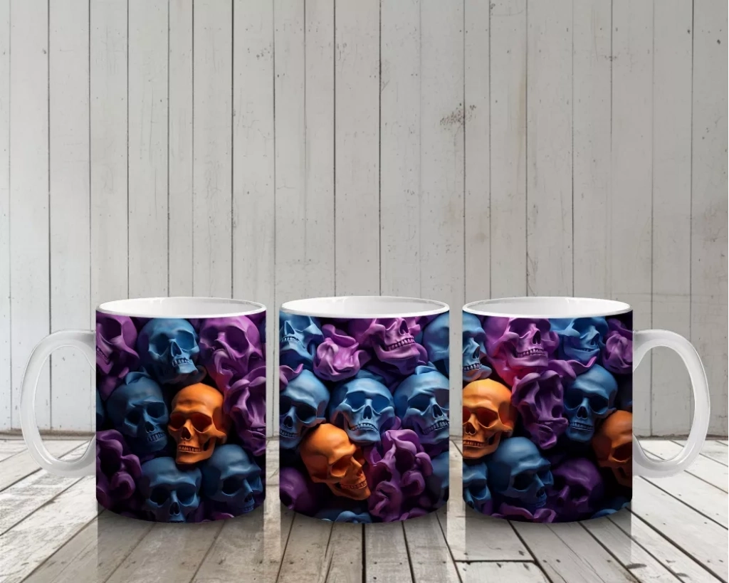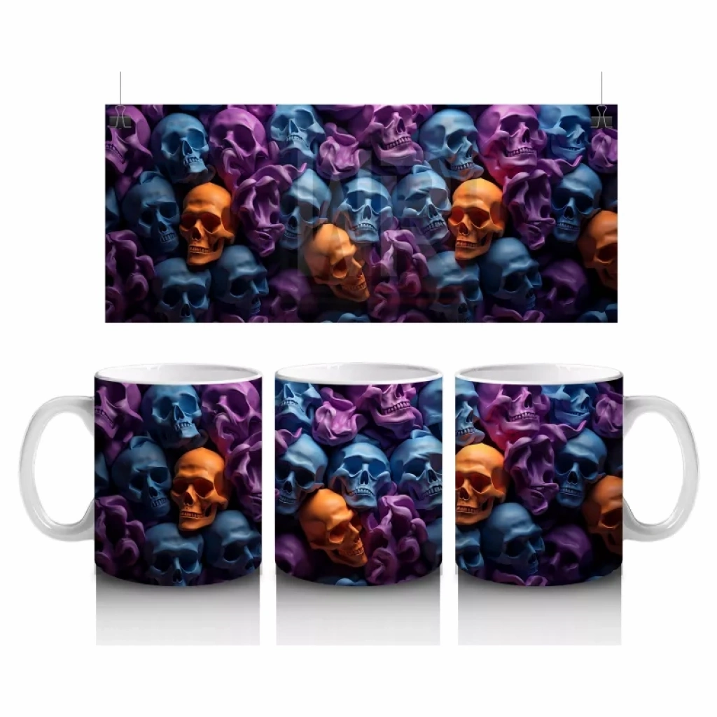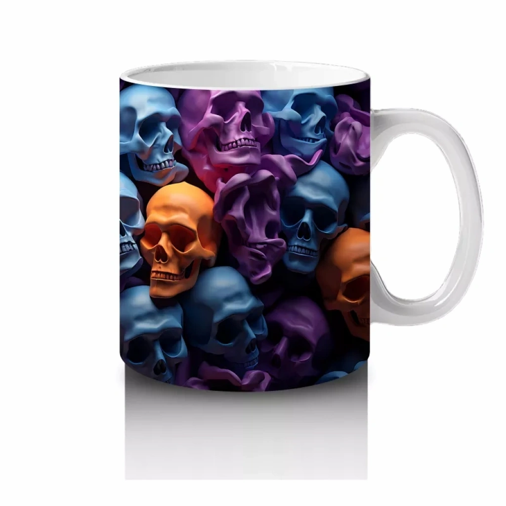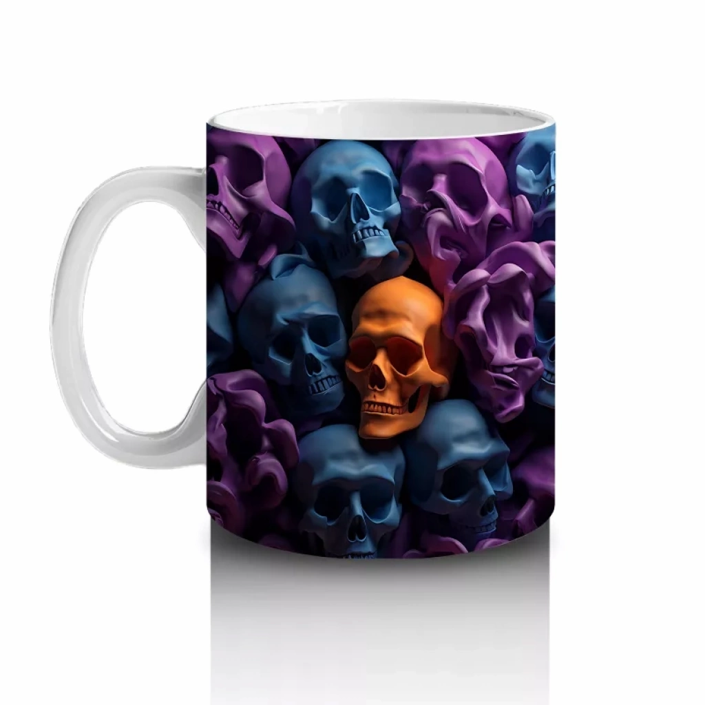 Renkli Kafataslarıyla Dolu Karanlık Duvar – Hediyelik Kahve Kupası Karanlık bir duvarı süsleyen rengârenk kafatasları, bu baskılı kupada gotik ve modern estetiği bir araya getiriyor. Cadılar Bayramı temalı dikkat çekici bir hediyelik kahve kupasıdır.