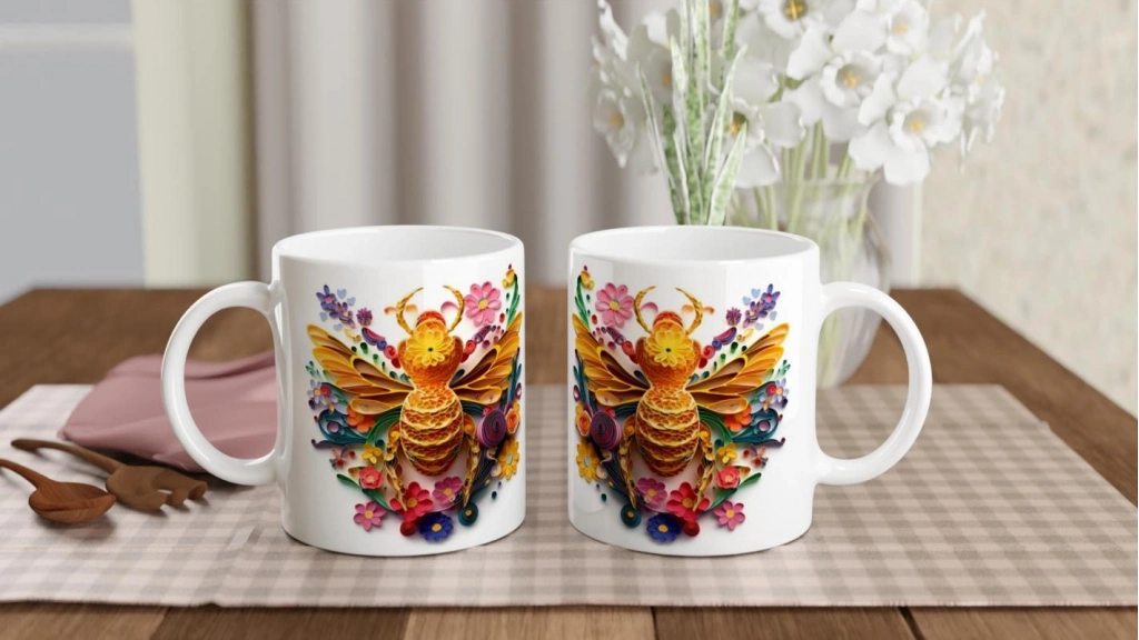 Sanat ve doğanın zarif dansı bu kupada buluşuyor! Canlı renkli kağıt kıvrımlarıyla işlenmiş arı ve çiçek desenleri, baharın enerjisini fincanınıza taşıyor. Her sabahı neşeyle karşılamak, iş yerinde masanızı renklendirmek ya da sevdiğinize anlamlı bir hediye vermek için harika bir tercih. Bu kupa sadece içecek taşımıyor; ruhunuzu da renklendiriyor!