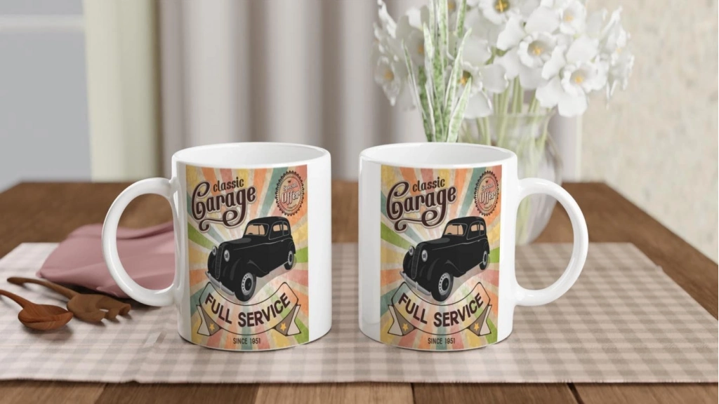 Canlı pastel tonları ve klasik araba illüstrasyonuyla süslenmiş bu retro garage kupa bardak, otomobil meraklıları için özel bir koleksiyon parçası.