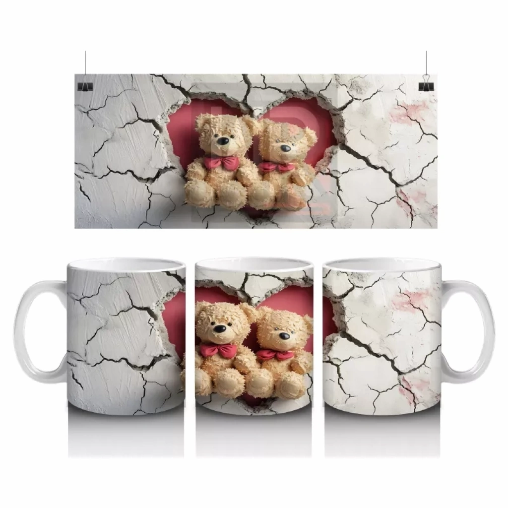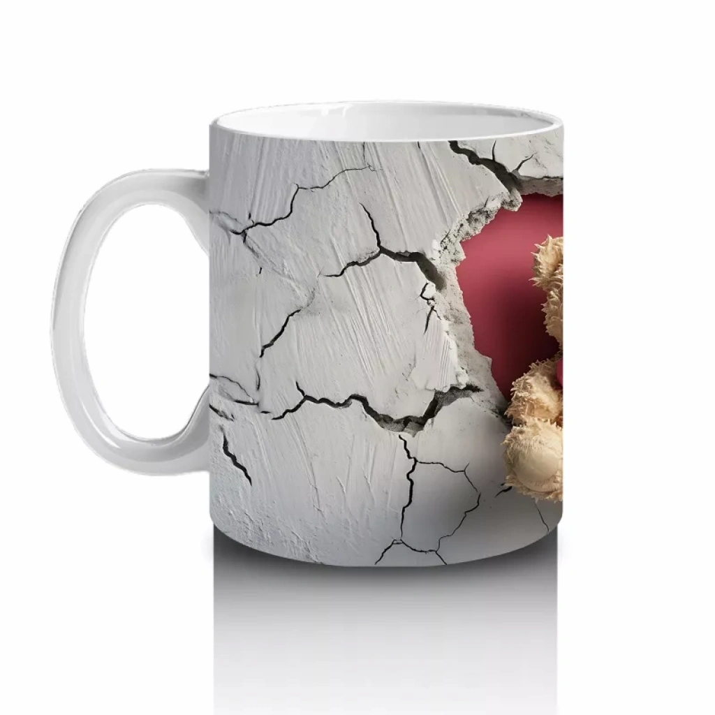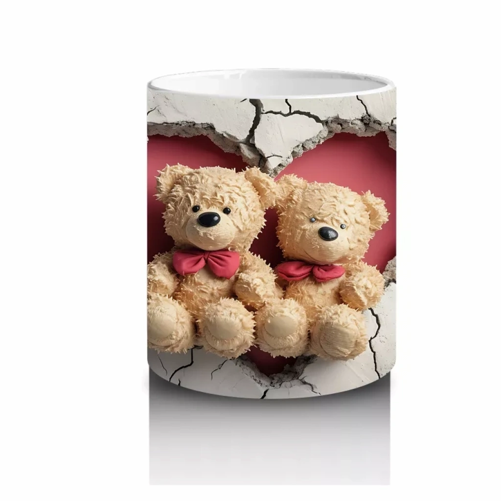 Ön ve arka yüzeyde romantik poz veren ayıcıklar, sevgi ve birlikteliği çift yönlü olarak yansıtıyor. Sıcacık ve duygusal tasarımlar arayanlar için özel bir kupa alternatifi.