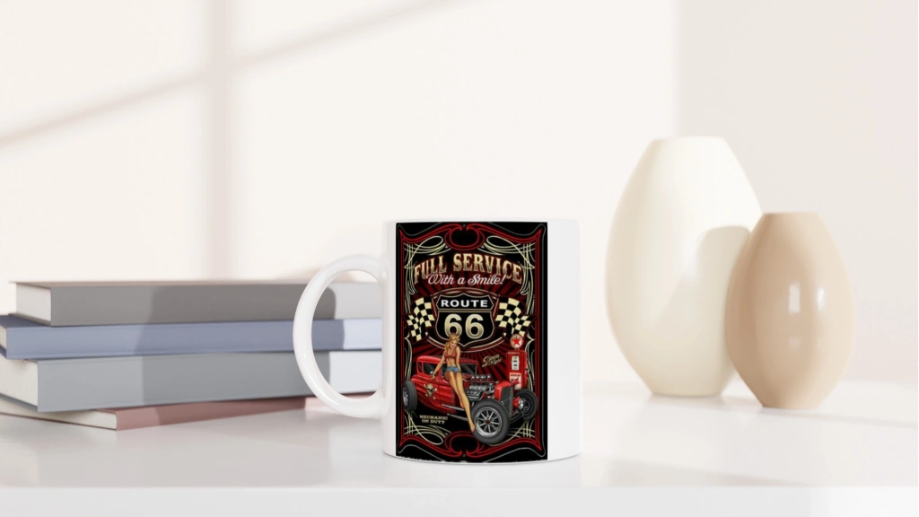 Gece boyu açık retro servis istasyonu temalı bu kupa bardak, nostalji severler için tam gaz eğlence sunuyor.