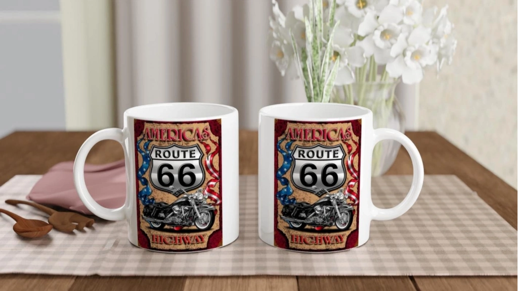 Efsanevi Route 66 tabelasıyla öne çıkan bu bardak, vintage tarzda hem dekoratif hem kullanışlı bir parça sunuyor.