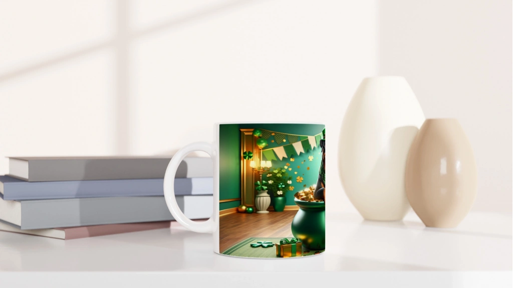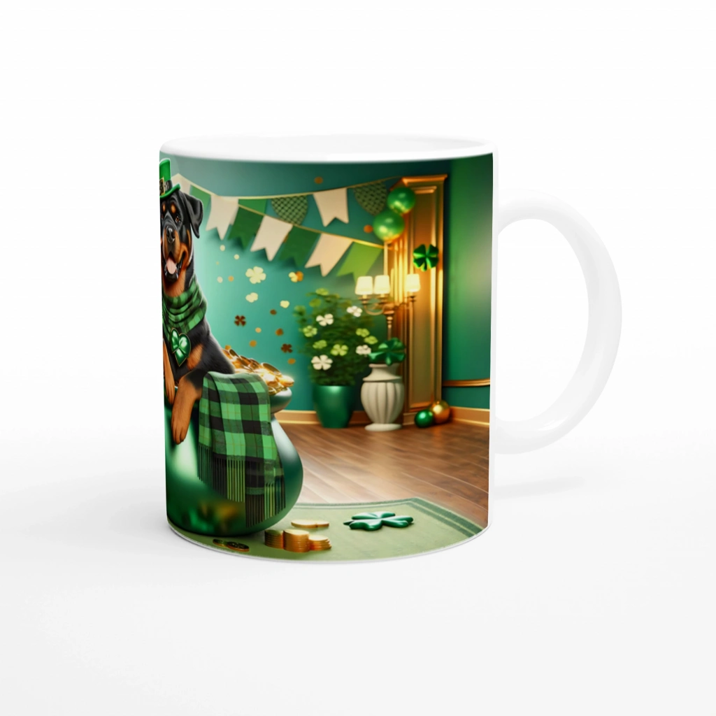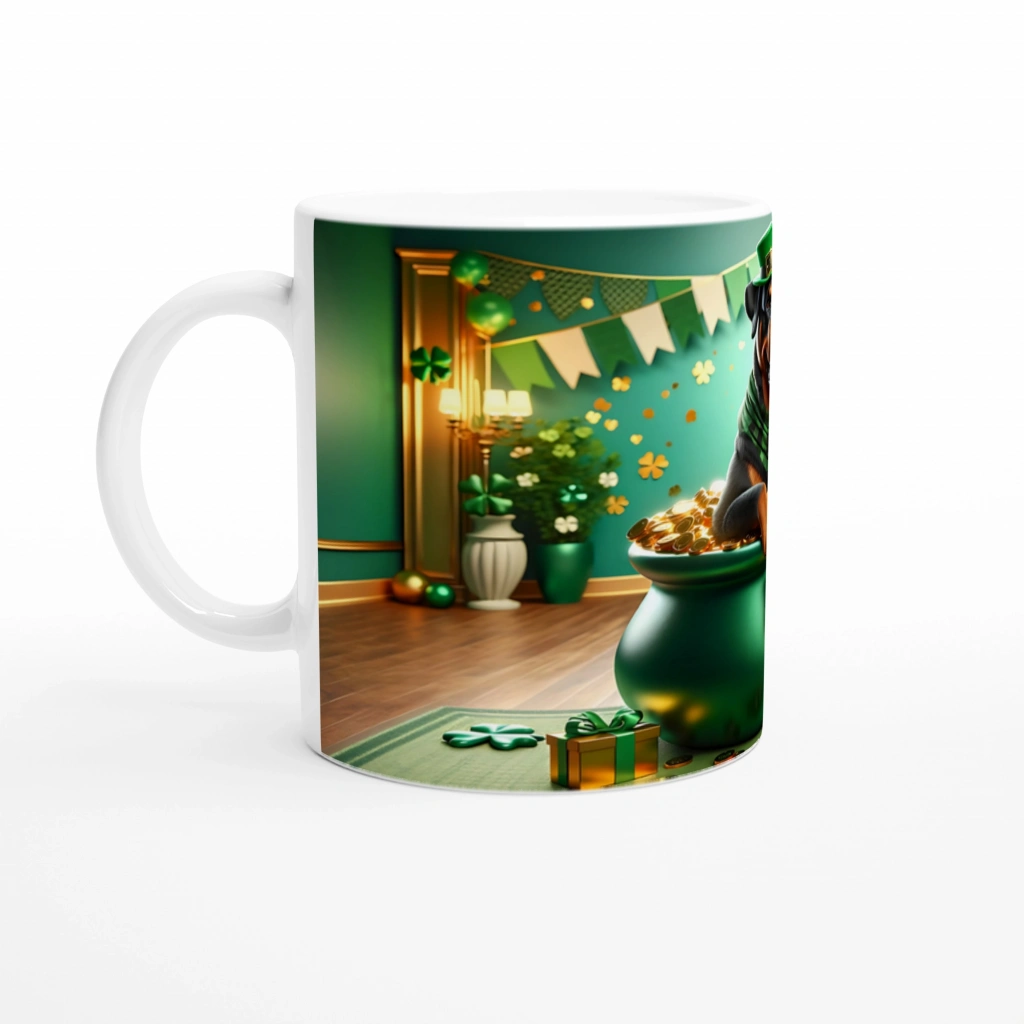Şansın Koruyucusu Rottweiler Temalı Baskılı Kupa Bardak, altın sikkelerle dolu kazan içinde konumlanmış sevimli bir rottweiler figürüyle dikkat çeker. Yeşil tonlarda St. Patrick’s günü konsepti, dört yapraklı yoncalar ve zarif dekorasyonlarla birleşerek neşeli ve güçlü bir atmosfer oluşturur.