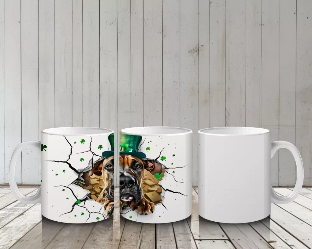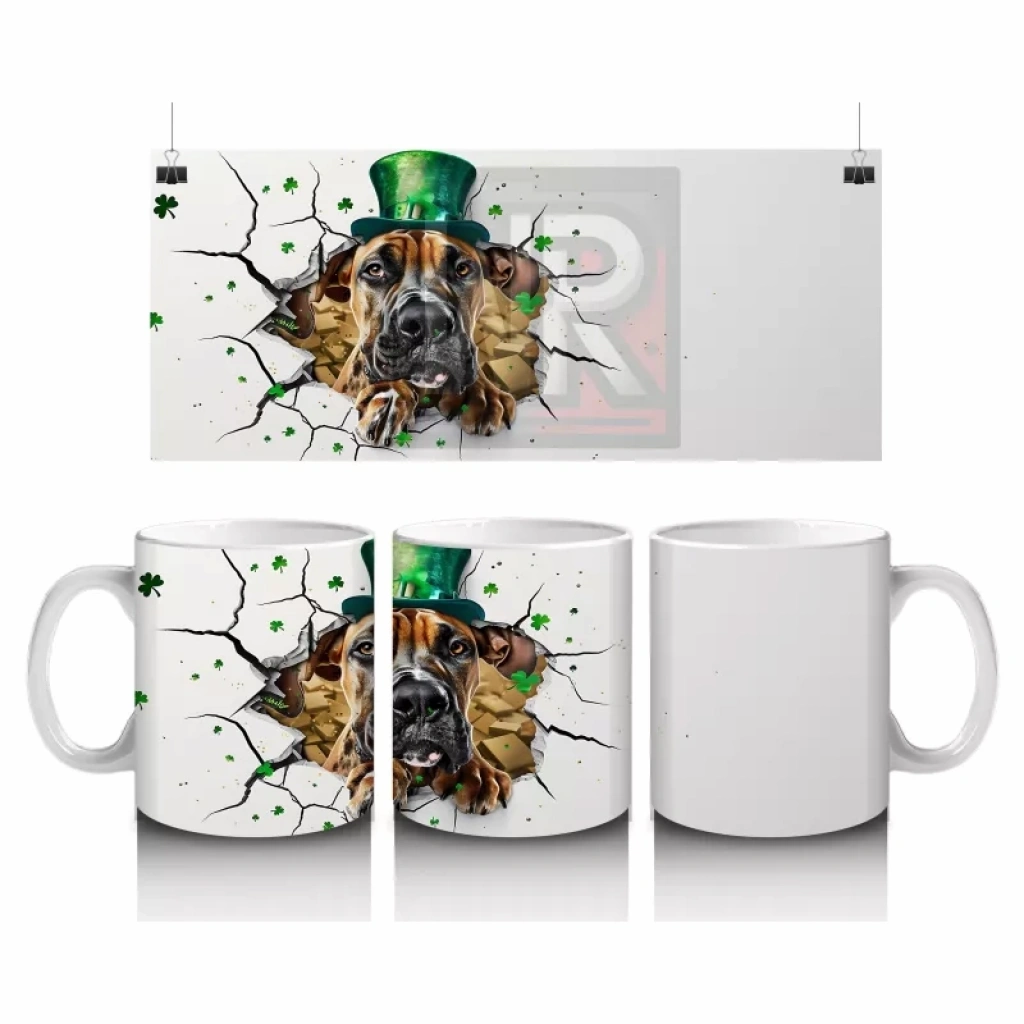 St. Patrick şapkası ve yonca detaylarıyla süslenen bu boksör köpek, hem sempatik hem de güçlü bir duruş sergiliyor. Neşeli ruhu yansıtan, tematik kupa koleksiyonları için mükemmel bir tercih.