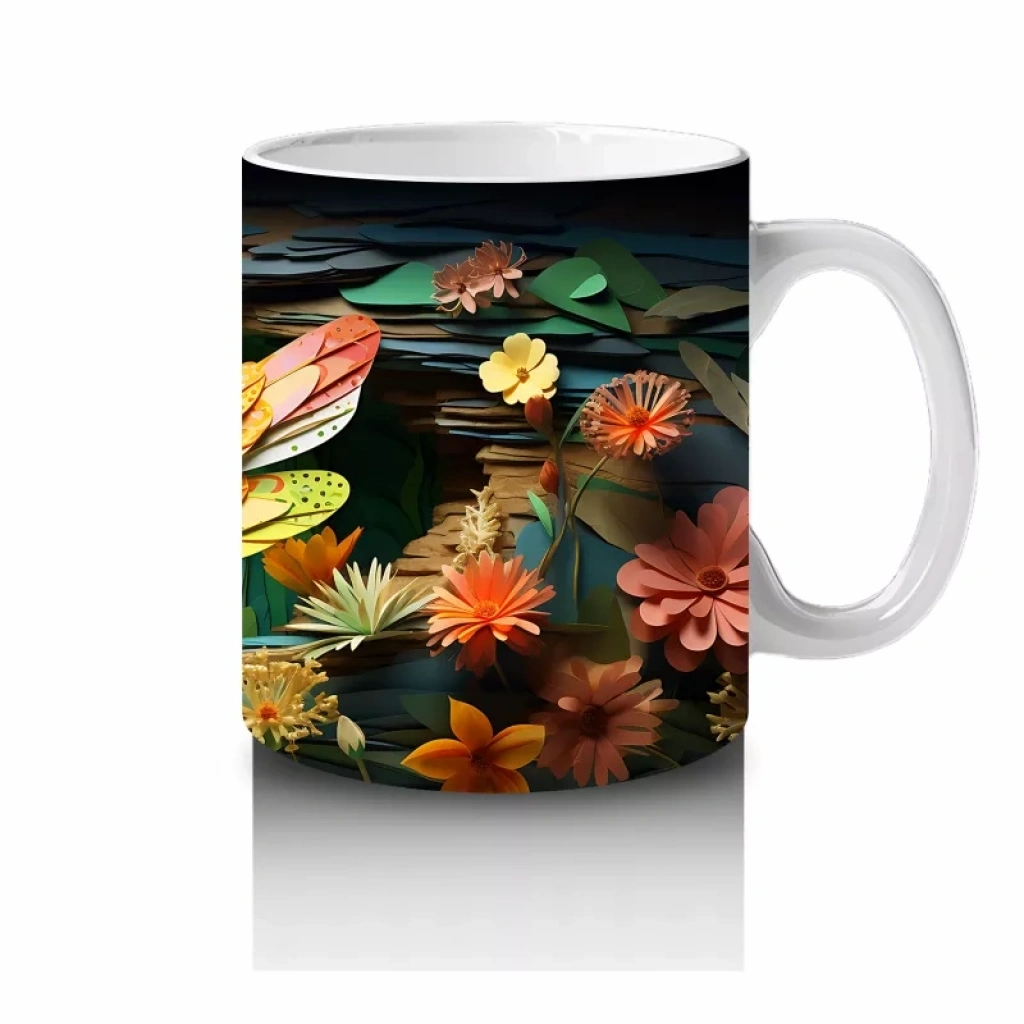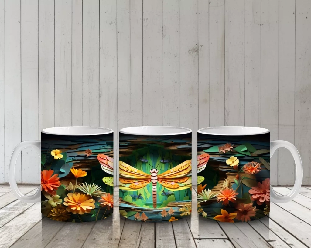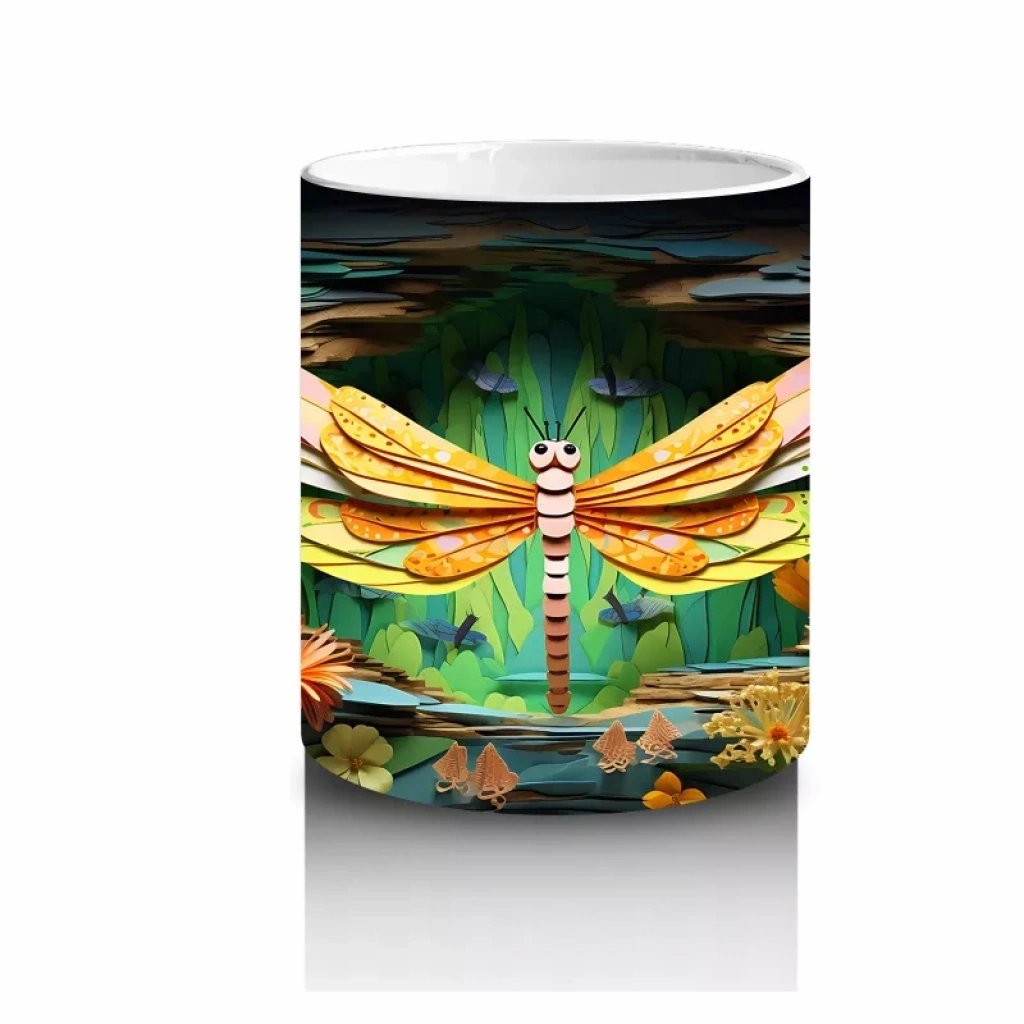 Sarı Çiçeklerle Bezeli Suda Yansıyan Yusufçuk Deseni – Baskılı Kahve Kupası