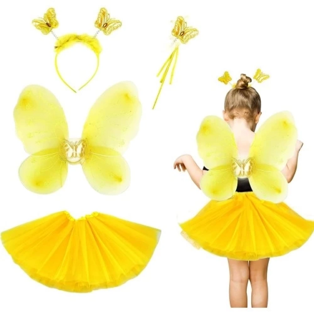 SARI KELEBEK KOSTÜMÜ ÇOCUK 4 PARÇA SETÜrün ÖzellikleriMalzeme: Yumuşak ve rahat, kaliteli kumaş.Set İçeriği:1 Adet Sarı Kelebek Kanat1 Adet Sarı Tül Etek1 Adet Sarı Antenli Taç1 Adet Sarı Kelebek MaskesiEbatlar: Çocuk bedeni için uygun, esnek ve rahat.Renk: Sarı ve siyah detaylar.Kullanım Alanı: Parti, kostüm etkinlikleri, Halloween, doğum günü kutlamaları.Özellikler: Kolay giyilip çıkarılabilen, hafif ve rahat bir kostüm.Paket İçeriği1 Adet Sarı Kelebek Kanat1 Adet Sarı Tül Etek1 Adet Sarı Antenli Taç1 Adet Sarı Kelebek Maskesi