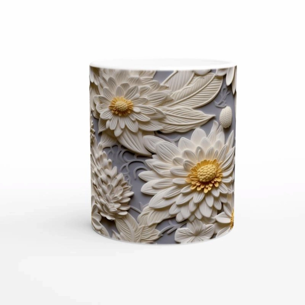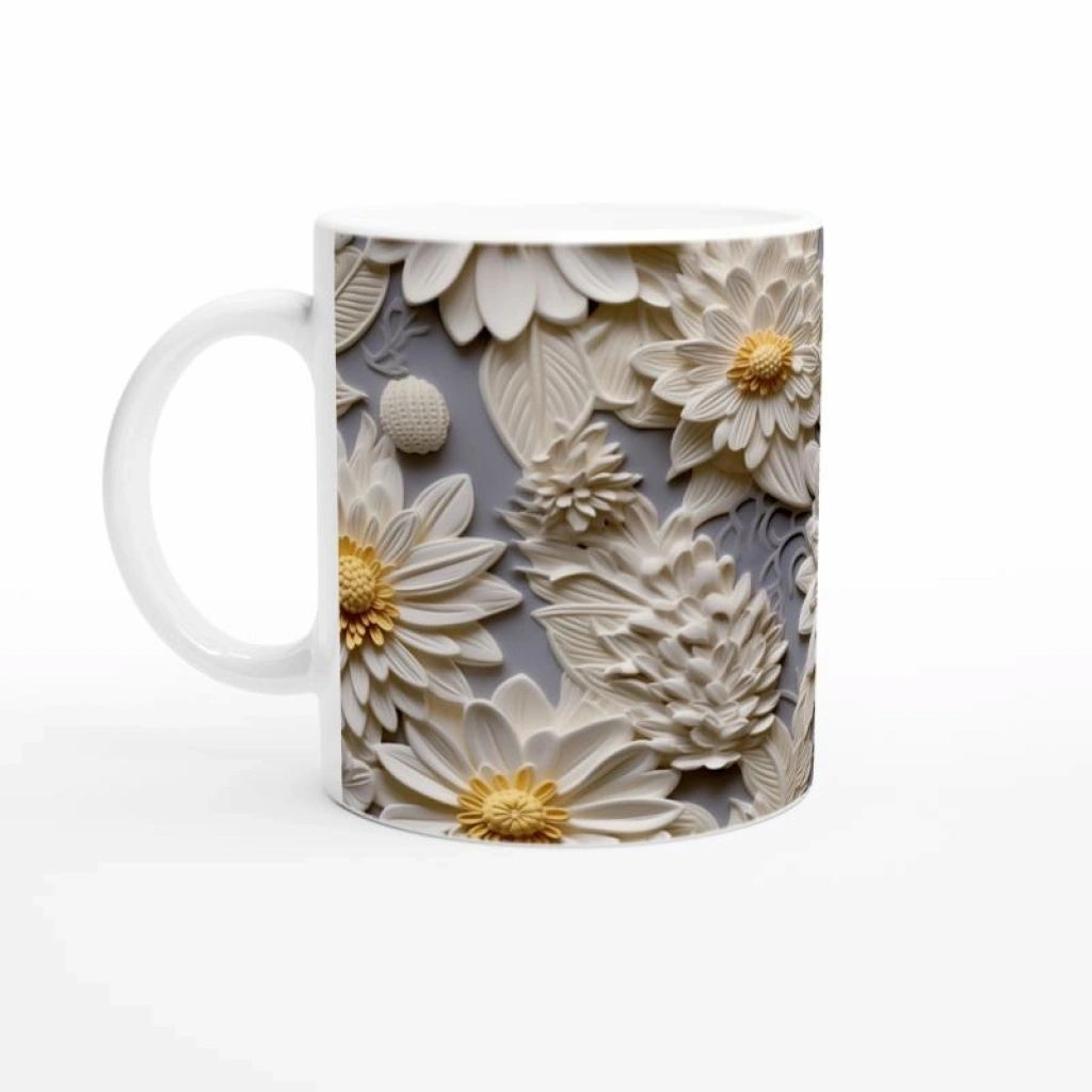 Kabartmalı beyaz yapraklar ve yumuşak zemin tonuyla tasarlanan bu kupa bardak, sade ve neşeli bir tarz sunar.