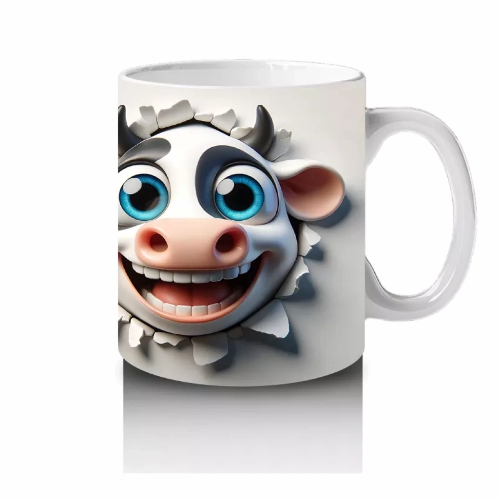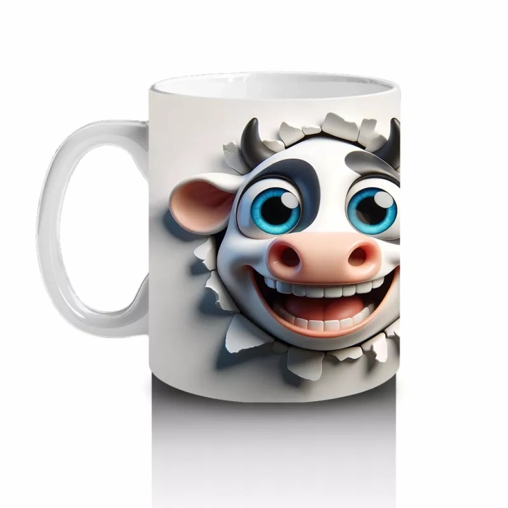 Yan yana duran bu sevimli inek çifti, sıcaklık ve samimiyet dolu bir görüntü sergiliyor. Aşkı ve dostluğu anlatan bu tasarım, her yaşa hitap eden neşeli bir kupa seçeneği.