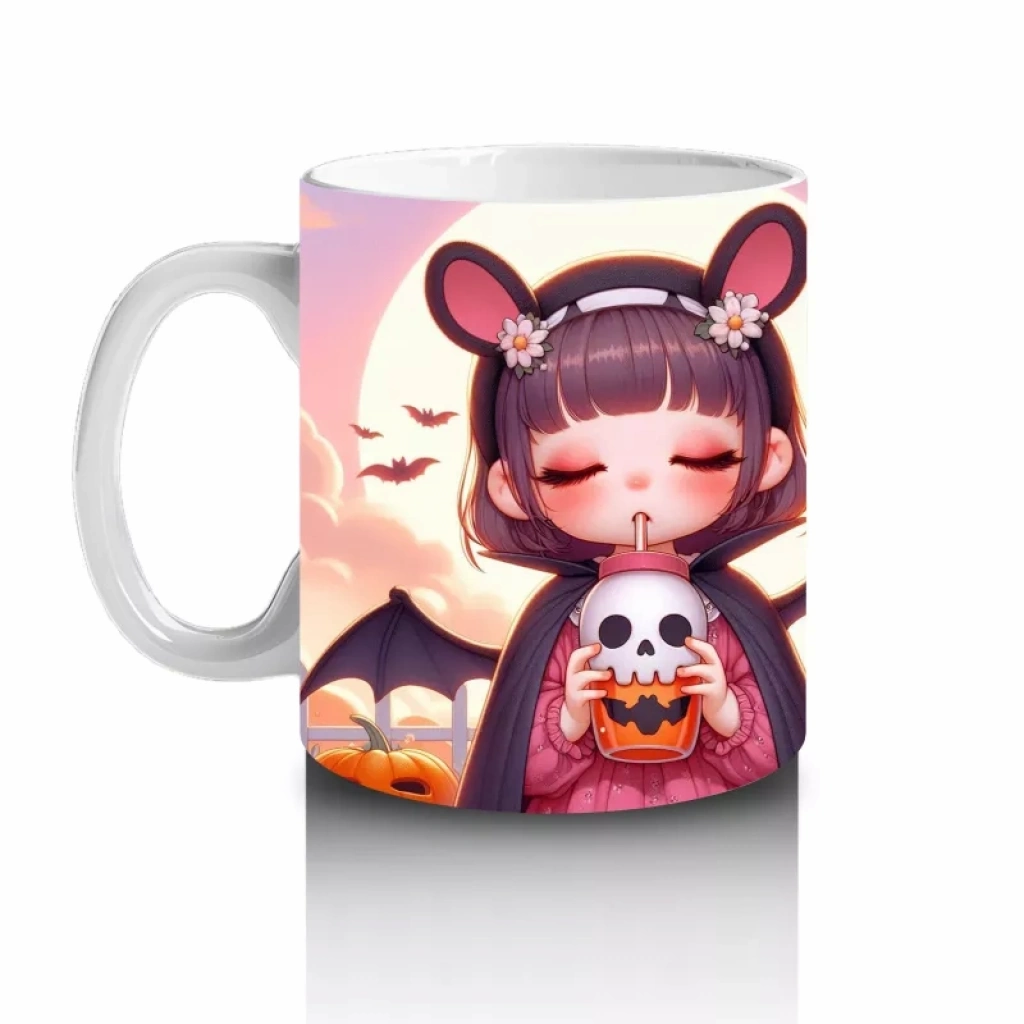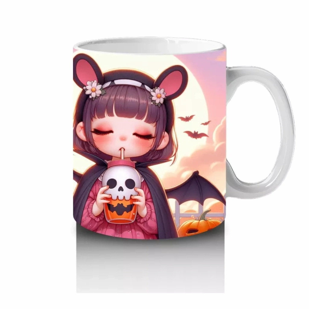 Sevimli kostümlü kız çocuk figürüyle tasarlanan bu tatlı kupa bardak, Cadılar Bayramı kutlamalarınıza neşeli bir dokunuş yapar.