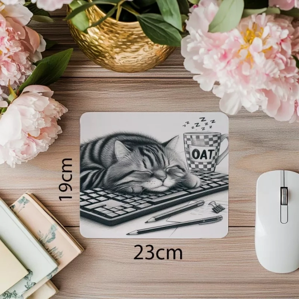 Şirin uyuyan kedi tasarımı el çizimi mouse pad, zarif detaylar, pürüzsüz kaydırma yüzeyi ve kaymaz tabanıyla rahat ve estetik bir kullanım sunar.